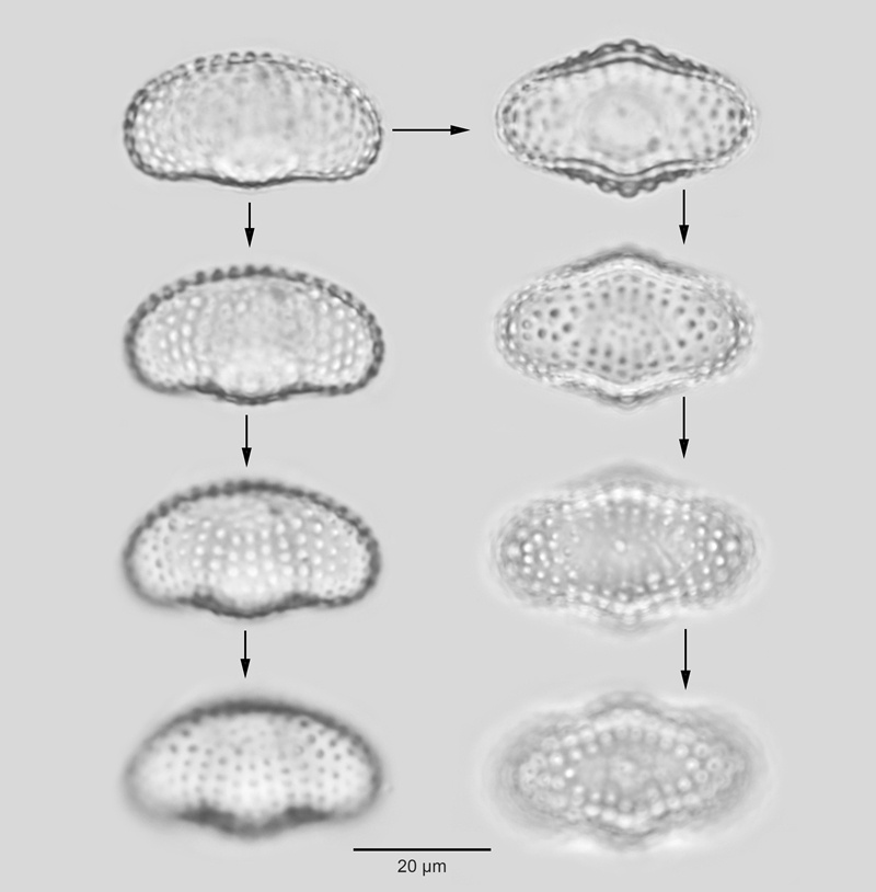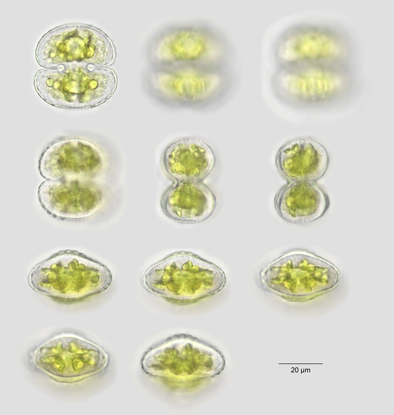 Appearing on the periphery there are single, relatively large granules combined with a series of seemingly vertical ridges in the semicell’s centre, as noted in the live cell. However, in the empty semicell the central protuberance shows up as a series of separate granules. There is superficial resemblance to C. subpunctulatum but the cells are more depressed in the taxon in question.