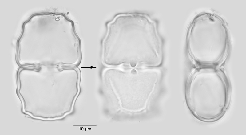 Cell dimensions: L: 45-47.2 µm; B: 24.4-29.3 µm; Is: 9.2-11.2 µm; Th: 19-20 µm; L/B: 1.61-1.85.