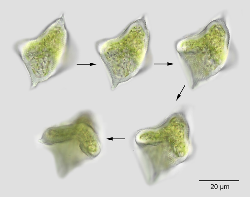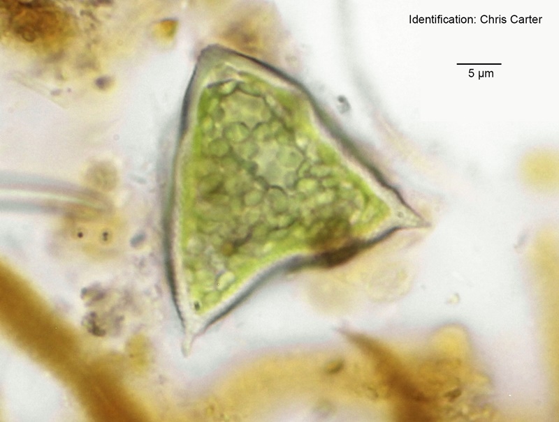This small alga is found in the phytoplankton and marginal vegetation in moorland pools and shallow bogs. Infrequently recorded but almost certainly overlooked.