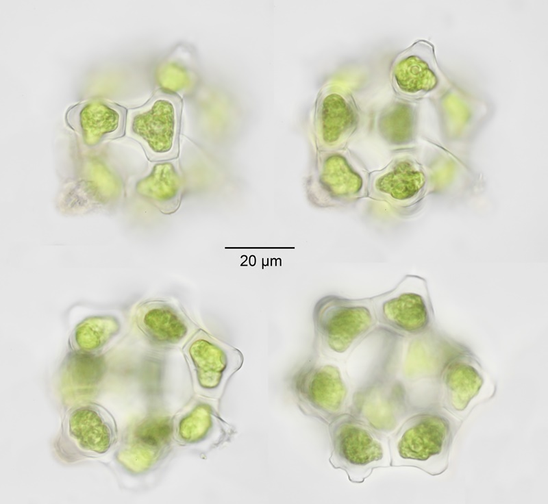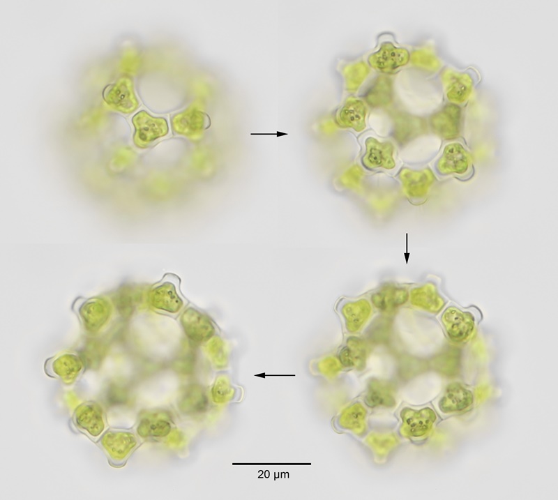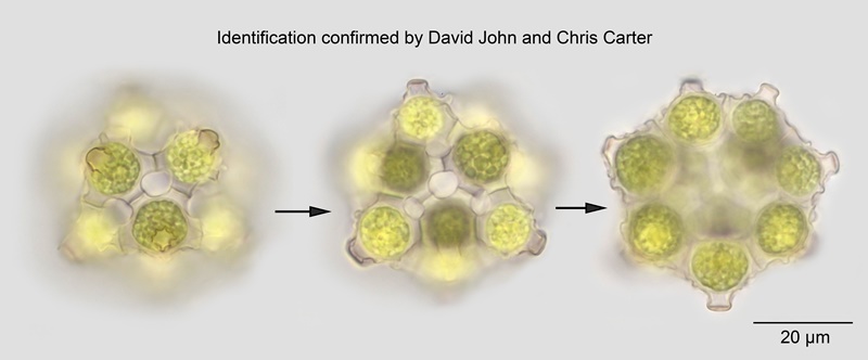 Coenobia broadly spherical, usually 8-16 celled; diameters: c.60 µm; Cell diameters: 15-23 µm.