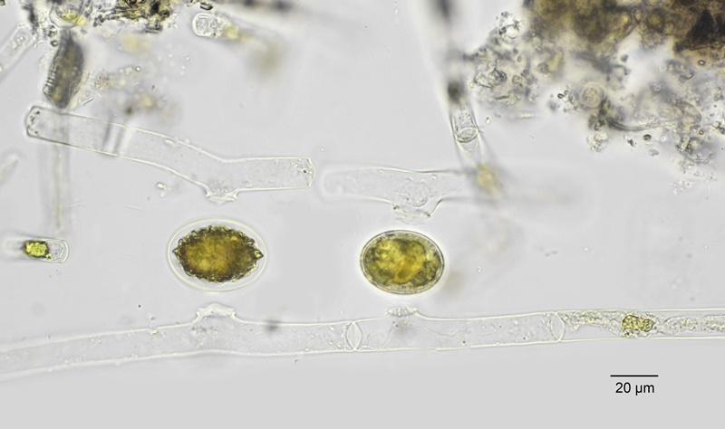 First described by Hassall (1843: 187, pl. 7: 15) as Sphaerocarpus ovalis but that genus does not appear to have been designated. It was moved to Mougeotia by Wittrock & Nordstedt (1886: 136). John et al. (2011: 585) record it as rare in the British Isles. As the specific epithet suggests, the zygospores are oval in shape with fine scrobiculation of the wall (difficult to see with the light microscope).