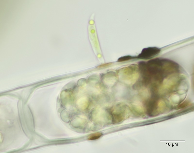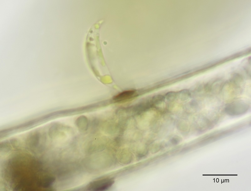 First described by Braun ex Kützing (1849: 892) as Characium minutum. It was later moved by Borzì (1895: 152) to its current position. One of numerous algae that grow attached to filamentous algae and other substrates. This species tapers to the apex but can present different profiles depending on the angle it was photographed at.
