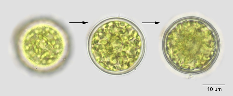 First described and illustrated by Klebs (1881: 300, pl. 4: 55-63). It has changed its name a couple of times in the interim but now reverted back to the original. John et al. (2011: 477, as Chlorochytrium facciolae (Borzì) Bristol 1920) describe it as “Cells spherical, ellipsoid or irregularly shaped, … walls thick and stratified; …”