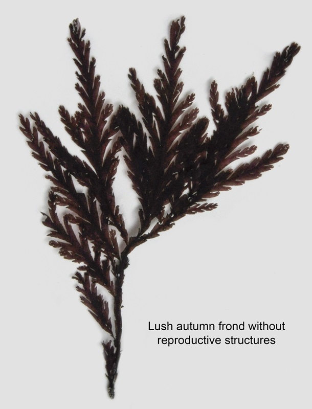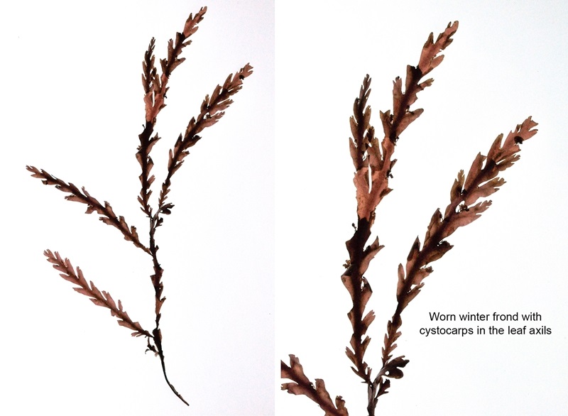 Purple-red fronds to 300 mm long, branching distichous, disc holdfast. Found on rocks in lower intertidal pools and subtidally on the stipes of kelp. A north-western species