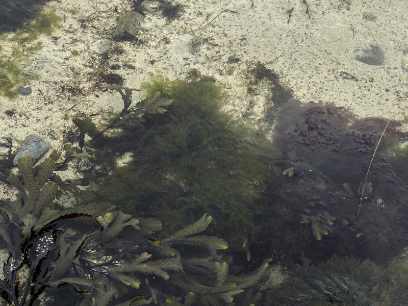 Dark green when viewed 'en masse', quite long and much branched. Most prominent in the mid-tidal zone and common. Very similar to other Cladophora