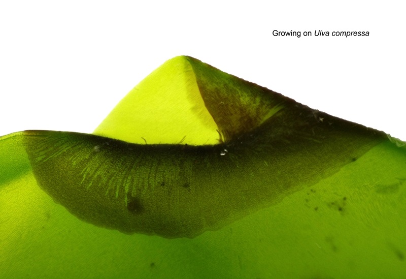 A brown epiphyte on species of Ulva, usually no more than 2 mm in diameter, often confluent. Fertile structures grow vertically from the central part. Not often reported but thought to be common