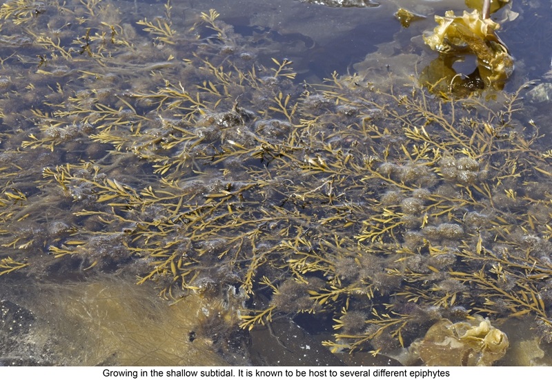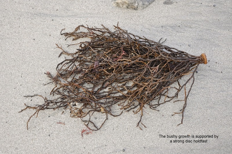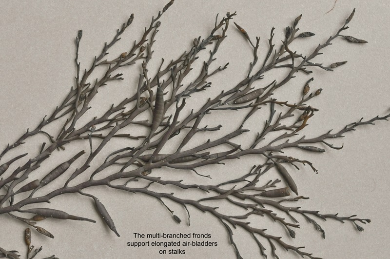 A fairly common seaweed of the middle to lower shore. A tough plant, up to a metre in length, with a flattened main stem and alternate branches. The tips bear elongated air-bladders which are septate