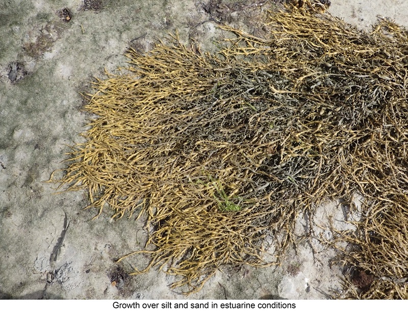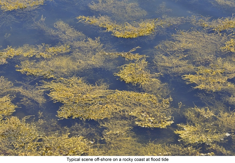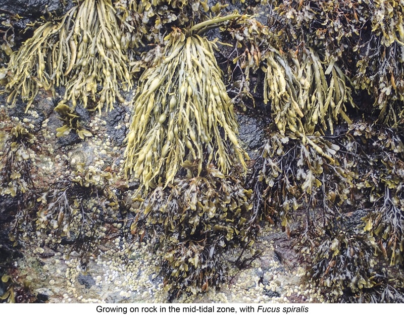 A common species of the middle shore. It has a narrow frond with a midrib, and air-bladders that are egg-shaped; these are produced annually in mature specimens. An important refuge for other plants and animals