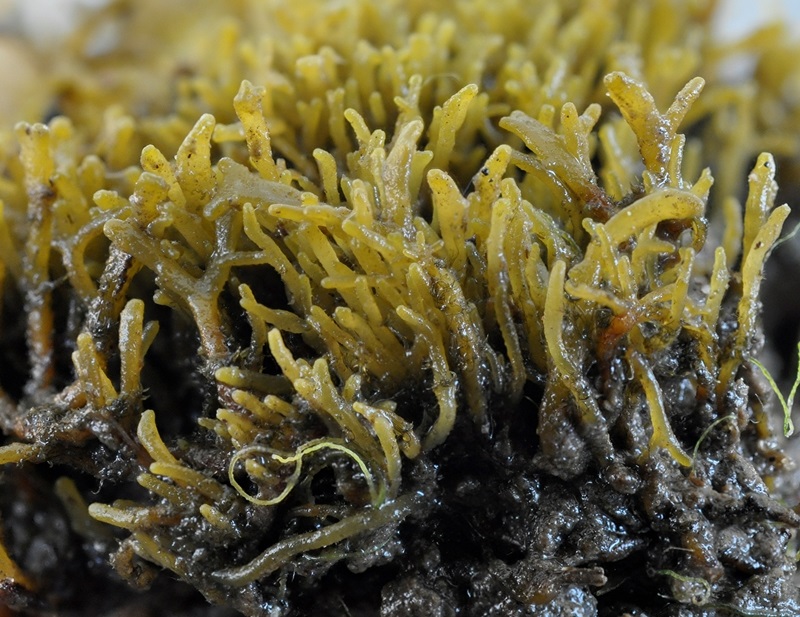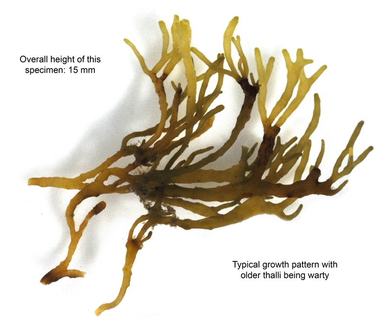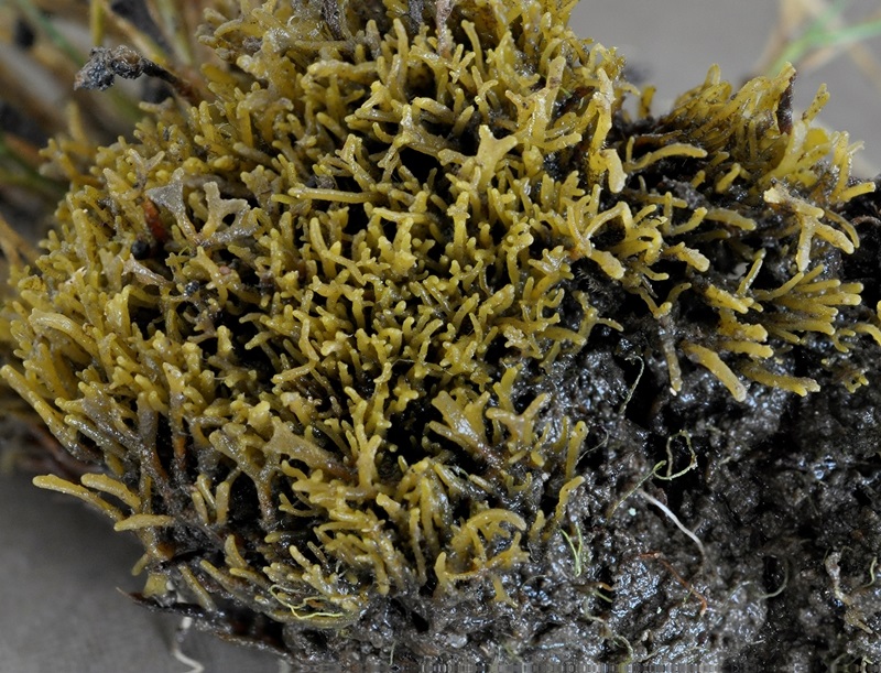 A small fucoid of saltmarshes which looks brown en masse, but quite yellowish in close up. It can achieve large, dense patches, spreading vegetatively. Rarely recorded and confined to the north-west coasts of Scotland and sporadically around Ireland