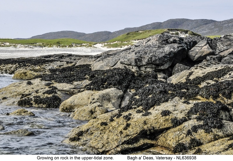 Growing on rocks in the upper intertidal zone. Superficially similar to other species, but easily identified. Very common all round the British coastline