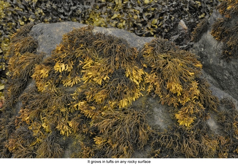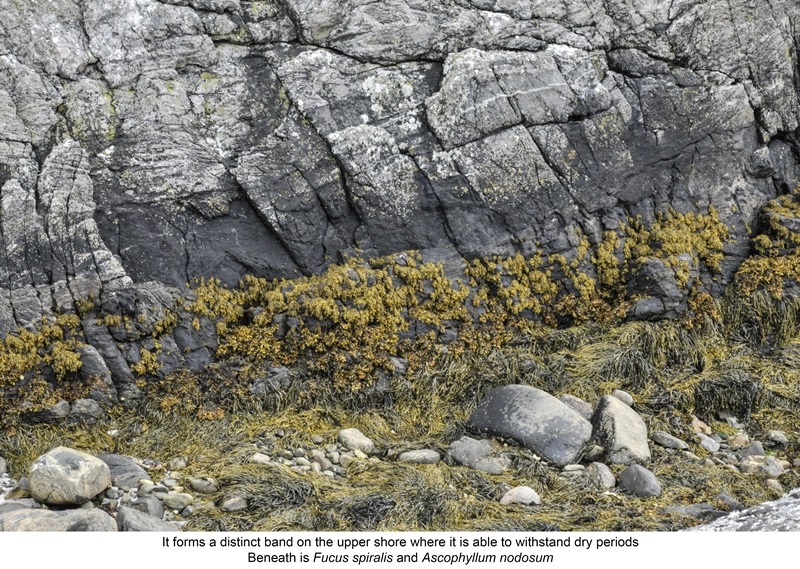 A seaweed of the upper shore. The name is derived from the curled frond that forms a 'channel'. Reproductive bodies are elongate and appear at the tip of the dichotomously branched fronds
