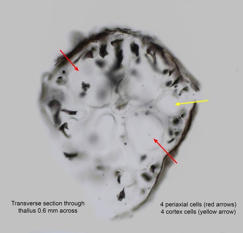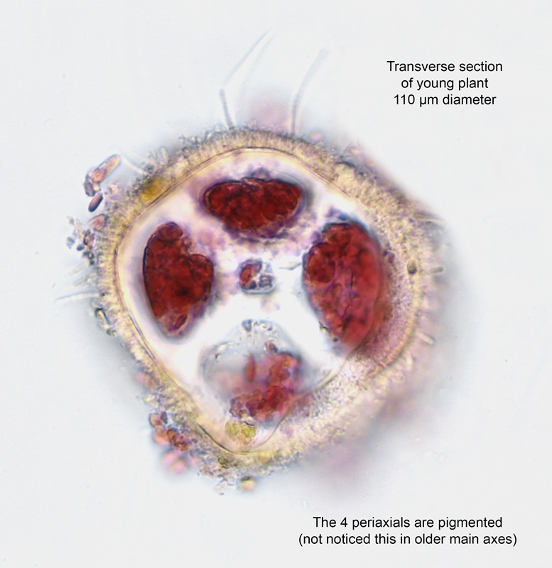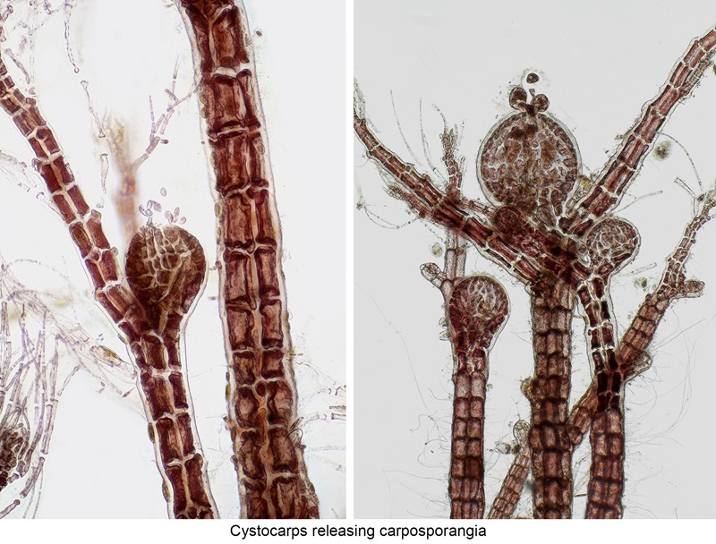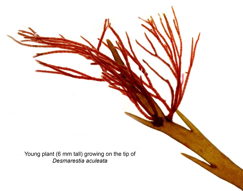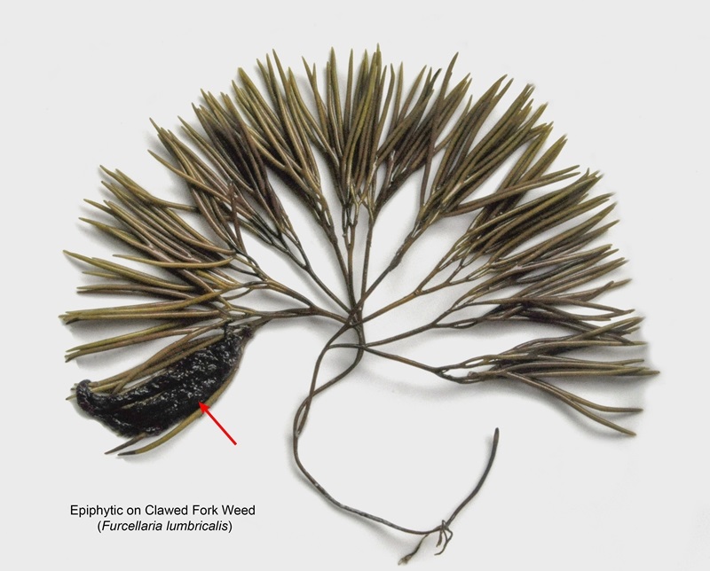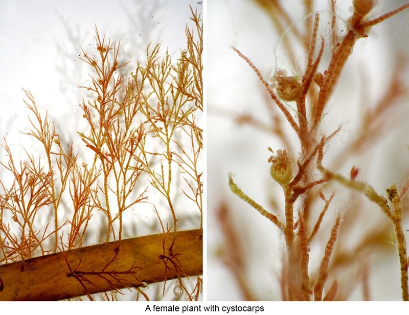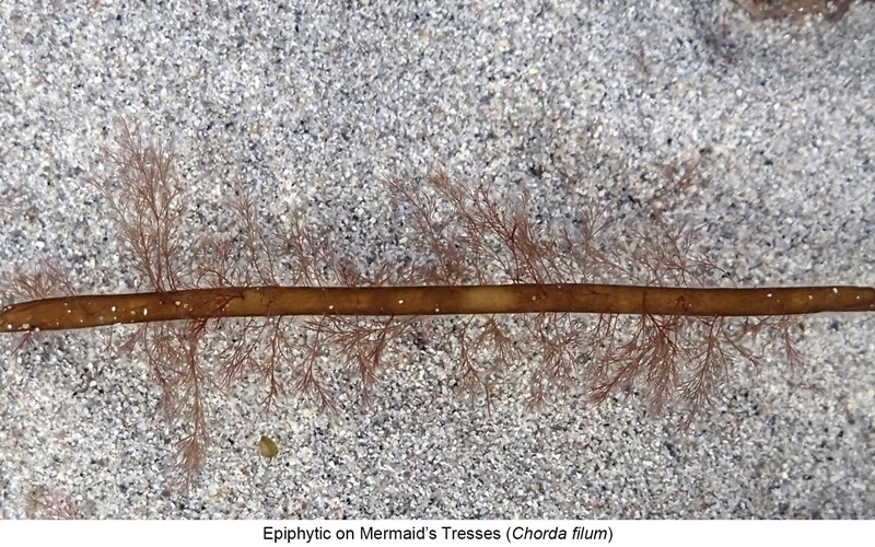 A short epiphyte with a dense cluster of rhizoids when growing on Codium (a preferred host), but other seaweeds also used. Found intertidally and off-shore, but infrequently recorded