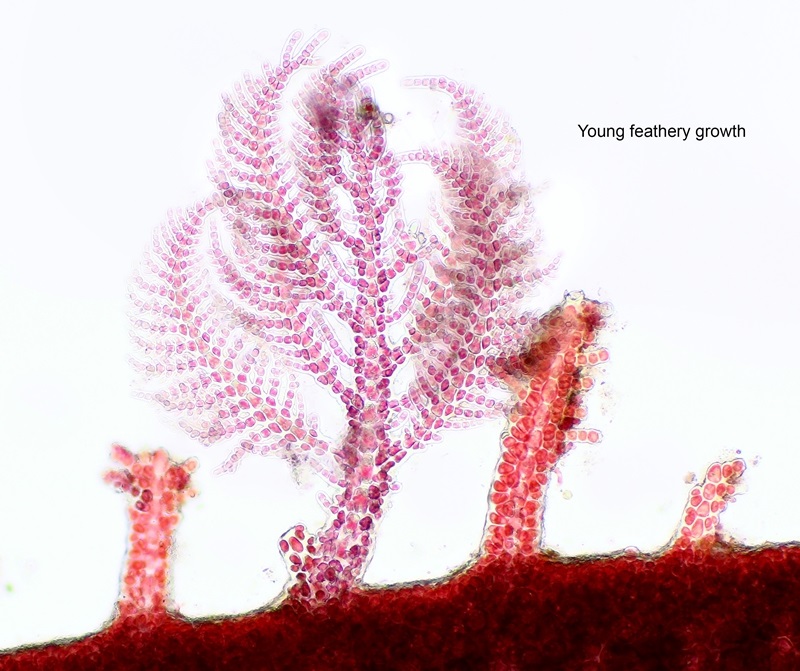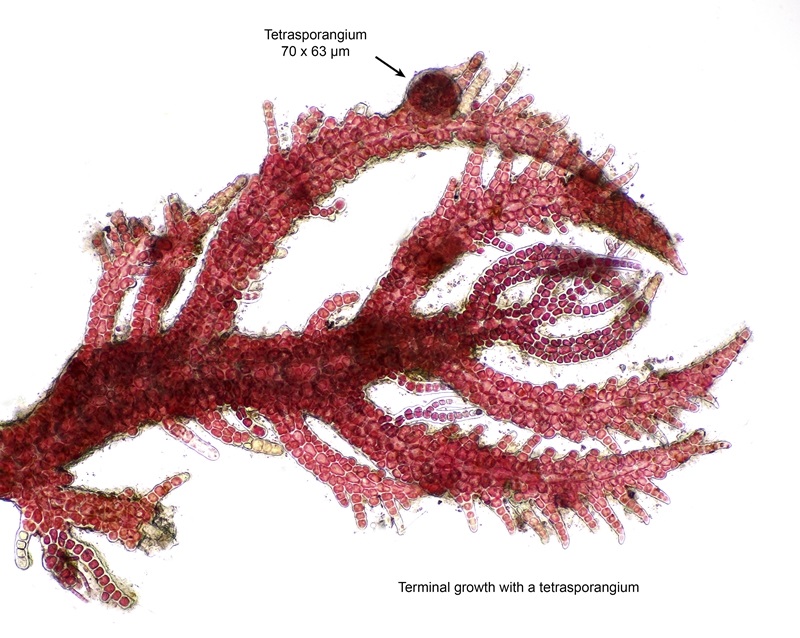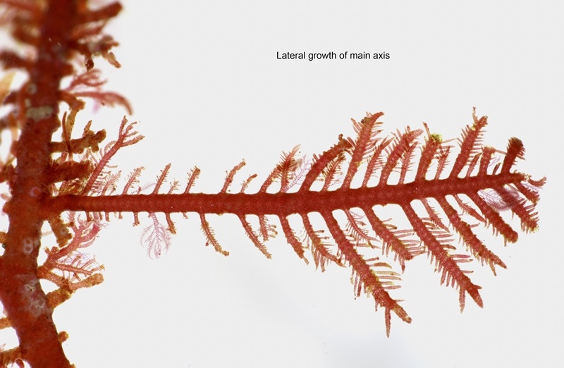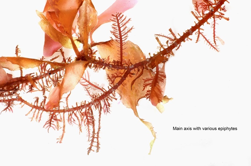 Fine, filamentous, very delicate with opposite long and short branches which are regularly alternate. A red seaweed that can be found on the mid to lower shore in crevices and overhangs, but characteristically occurring as an epiphyte on the stipe of Forest Kelp Laminaria hyperborea. These can be observed on beaches after winter storms