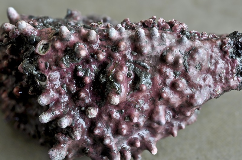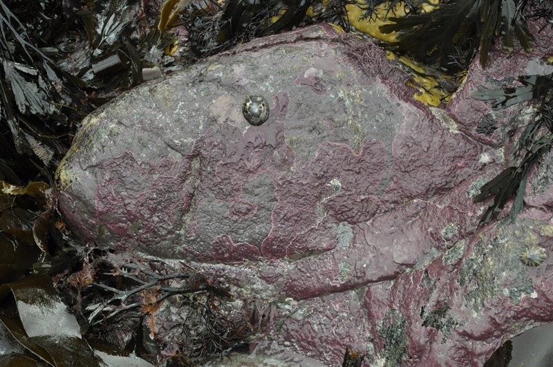 It's hard to believe that the pink coating on rocks between the middle and lower shore is calcareous algae. It has two forms; one is unattached, the other encrusting. Both produce nodules, branched in the unattached form