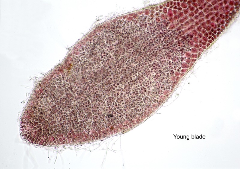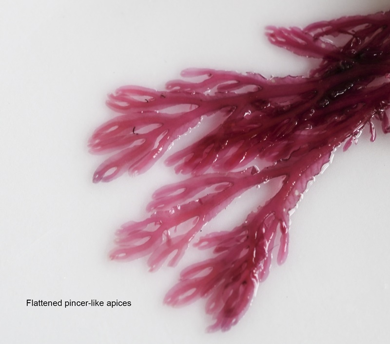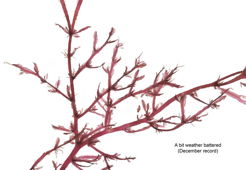 Common on the lower shore and below, growing on rocks and on Laminaria stipes. The thallus has wing-like side growths and young growths are blade-like. Can look quite battered in winter