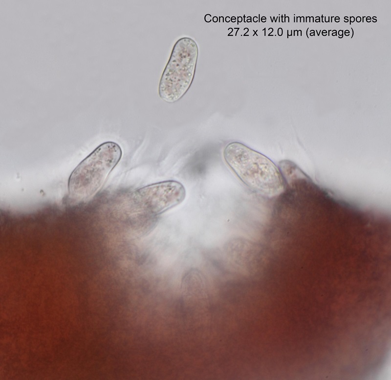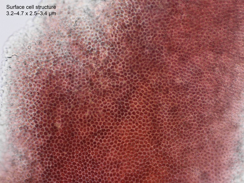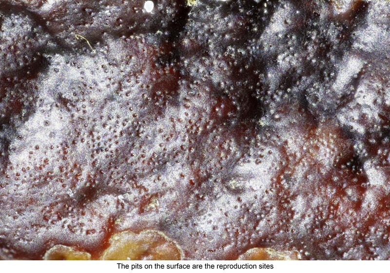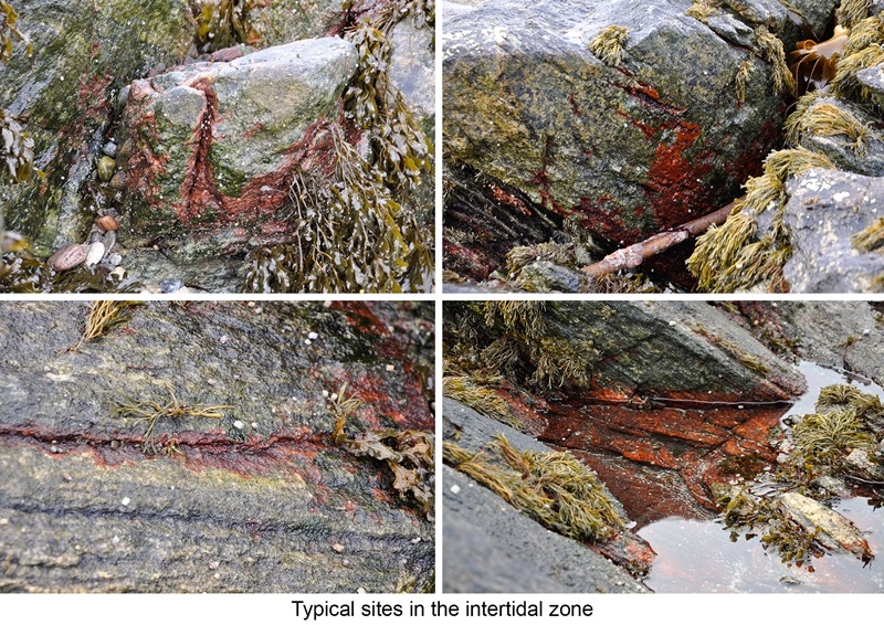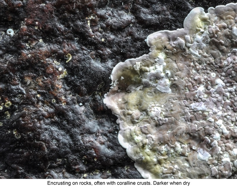 An encrusting brownish-red alga, no more than half a millimeter thick. Can be found on rocks in the littoral zone and upper-shore rock-pools. Common